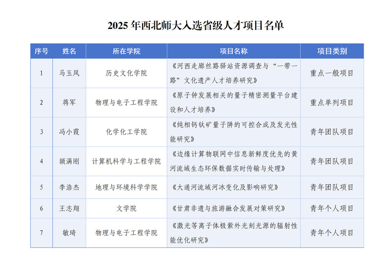 西北师大7个项目入选2025年省级人才项目