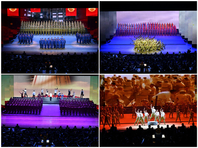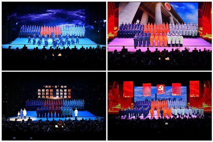 《“两弹一星”组歌》(后称《组歌》),运用交响合唱的形式,以大型表演唱、对唱+合唱、集体表演唱、领唱+情景表演合唱、混声唱等表现形式,再现了“两弹一星”事业的伟大历程。