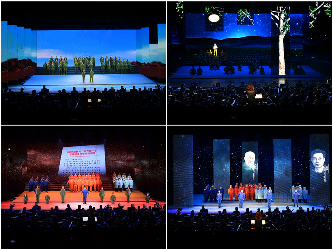 《组歌》分为《序》《创业篇》《脊梁篇》《梦想篇》《尾声》五个部分,由14首相互独立又紧密相连的曲目构成,“两弹一星”精神贯穿各个部分,交响乐、合唱、情景表演、背景视频、灯光音响等诸多要素浑然一体,共同铸就一场高标准、高质量、高效率的艺术盛宴。